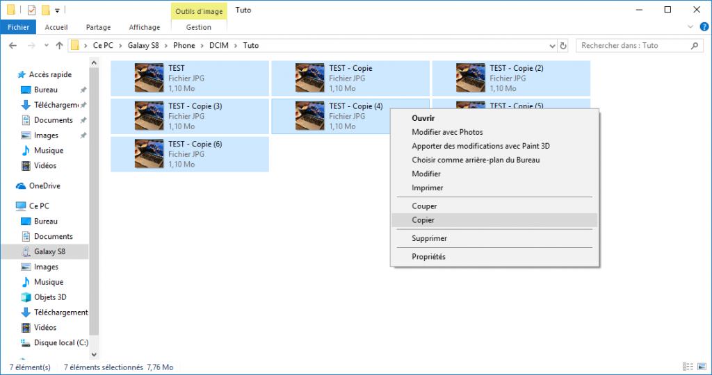 Pour commencer, allez dans votre explorateur de fichier pour Windows et Finder pour Mac OS, pour copier les photos que vous voulez transférer faites un clic droit sur les photos sélectionnées.